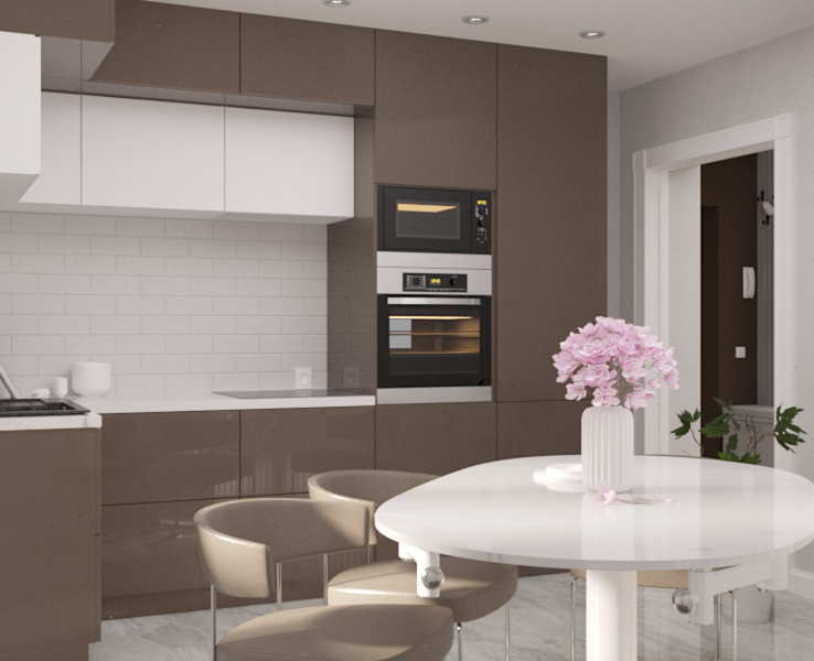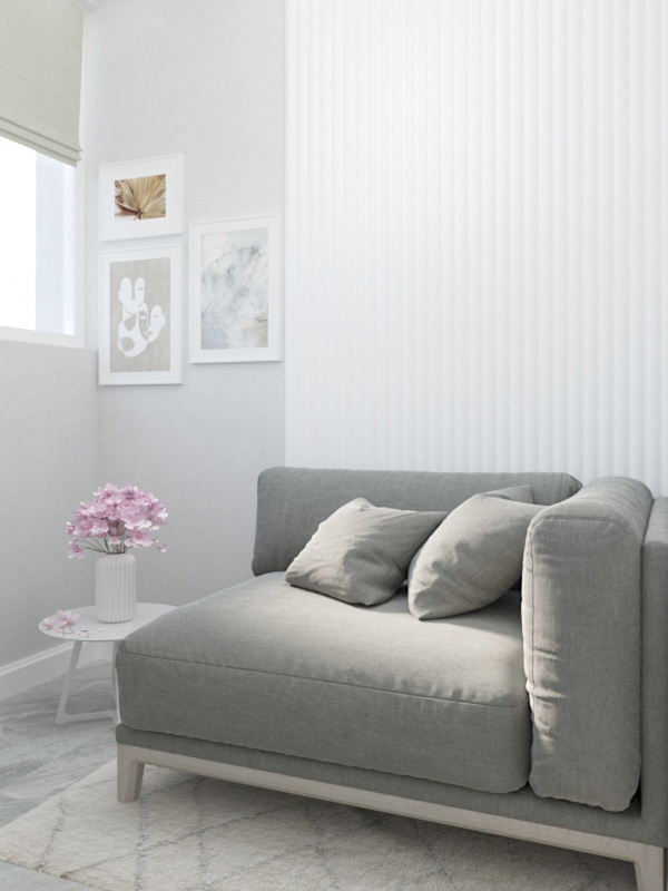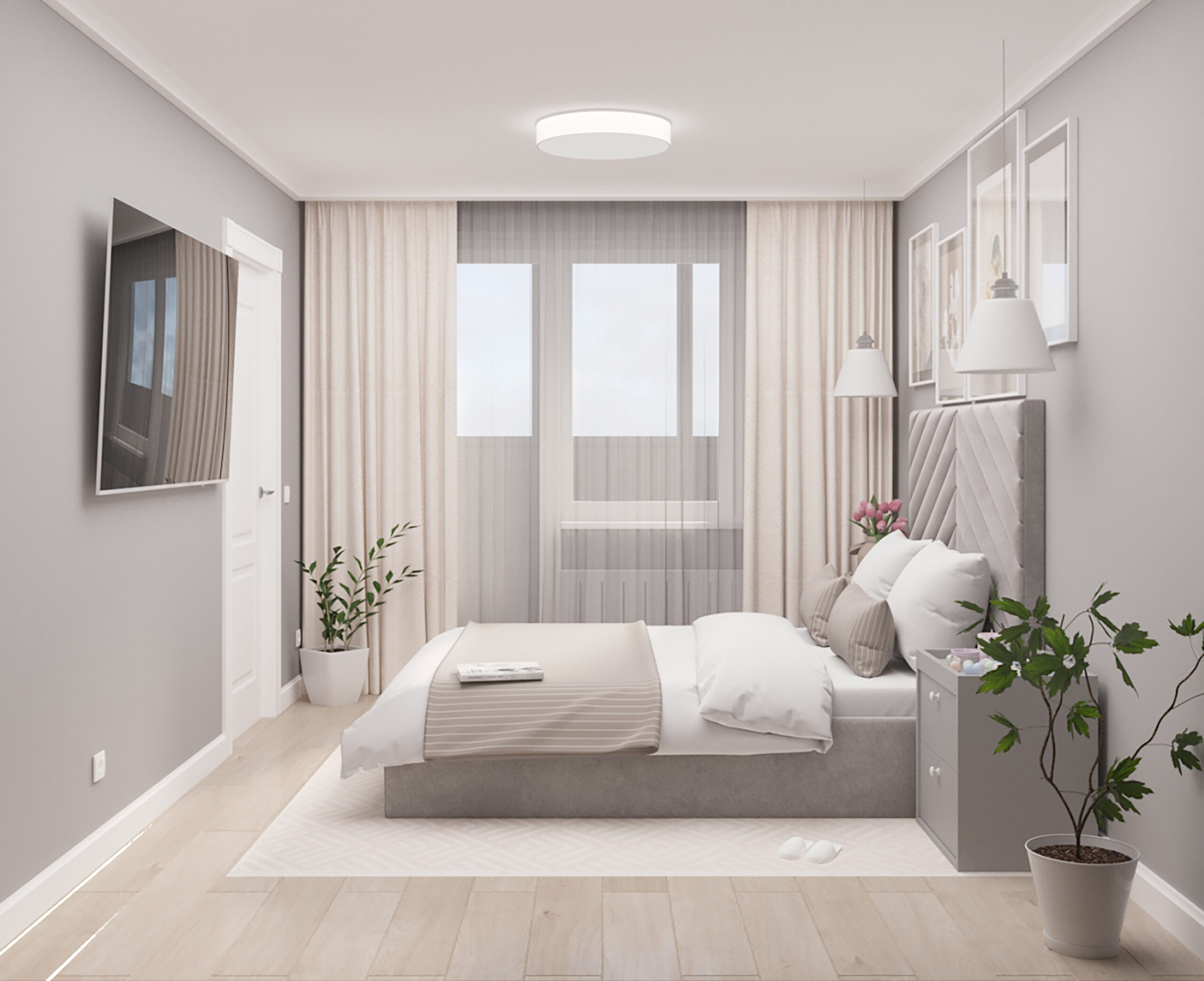 This apartment interior design combines modern minimalism with cozy elegance. Soft neutral tones, natural light, and carefully selected decor create a calming atmosphere in every corner. The bedroom features a sophisticated upholstered headboard, light curtains, and warm wood flooring for ultimate comfort. The lounge area is styled with a contemporary sofa, accent pillows, and delicate wall art, offering the perfect space to relax. Subtle greenery and fresh floral accents bring harmony and balance to the design, making the apartment feel both stylish and inviting.
